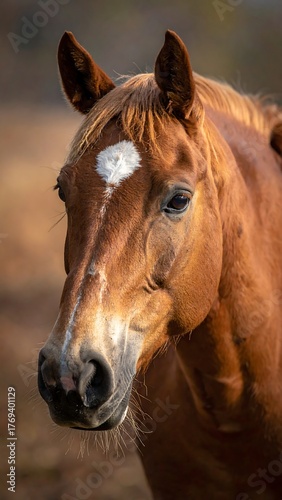 Fototapeta premium A close-up portrait of a chestnut horse. Its head is turned slightly, highlighting the eye, with a white spot on the forehead