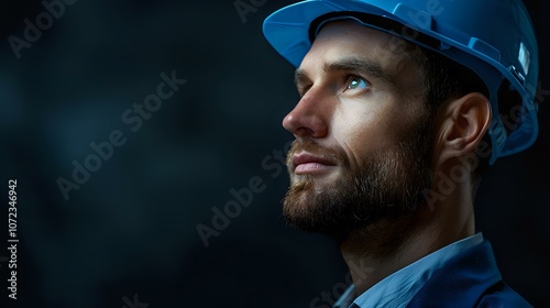 Fototapeta premium A close-up portrait of a construction worker in a safety helmet, gazing upwards with a thoughtful expression, embodying focus, leadership, and professional dedication.