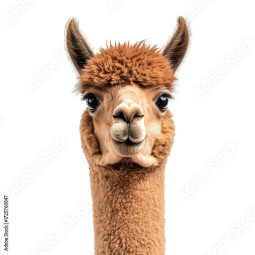 © kageyama, Obraz premium A close-up portrait of a curious alpaca with soft fur and expressive eyes. set against a plain white background. perfect for animal-themed content or educational materials
