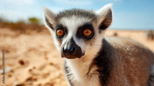 © M, Fototapeta premium A close-up portrait of a curious ring-tailed lemur looking at the camera.