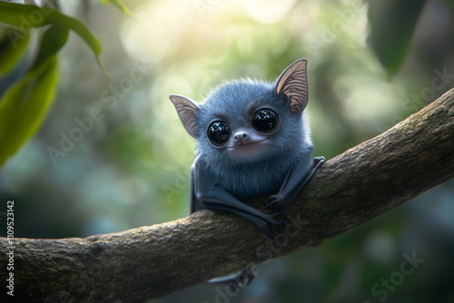 © Parvin, Fototapeta premium A close-up portrait of a cute blue bat hanging upside down on a tree branch in a jungle