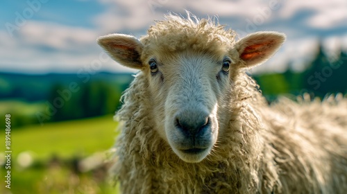 © Michael, Fototapeta premium A close-up portrait of a fluffy, white sheep looking directly at the camera.