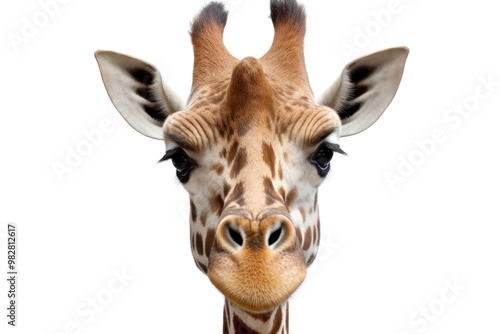 © Oratai, Fototapeta premium A close-up portrait of a giraffe head and neck, showcasing its unique spots and long eyelashes isolated on white background