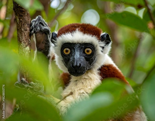 © Dino, Fototapeta premium A close-up portrait of a lemur with striking eyes peeks through the verdant foliage, clinging to a slender branch