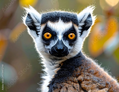 Naklejka premium A close-up portrait of a lemur with striking orange eyes and a ringed tail,...