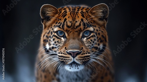 Obraz premium A close-up portrait of a leopard with piercing blue eyes looking directly at...