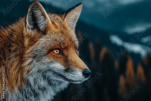 Naklejka premium A close-up portrait of a red fox with striking amber eyes, set against a...