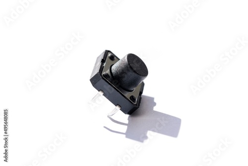 Naklejka premium A close up portrait of a small push button. The electric component is used in electronics on a on PCB or circuit boards. When the button is pressed, it activates another part of the circuit.