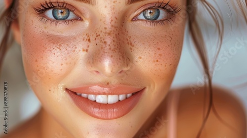 Fototapeta premium A close-up portrait of a smiling young person showcasing clear blue eyes, delicate freckles, and smooth skin, epitomizing natural beauty and vibrant health