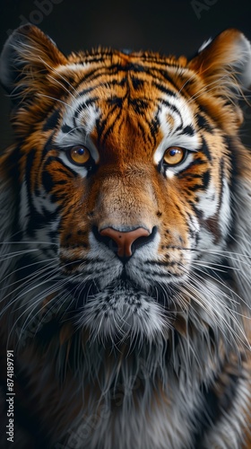 Naklejka premium A close-up portrait of a tiger, staring directly at the camera. Its orange...