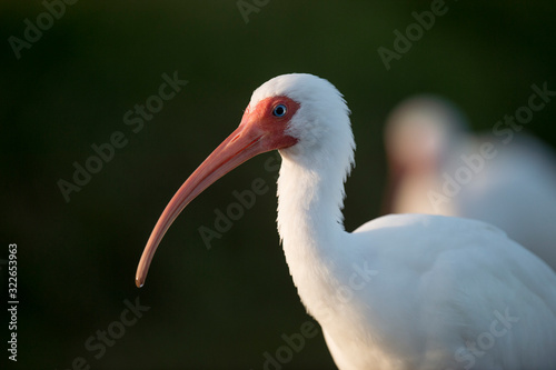 © rayhennessy, Obraz premium A close-up portrait of a White Ibis in the bright sun against a dark black background.