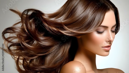 © Anastasiia, Obraz premium A close-up portrait of a woman with flowing, shiny hair and a serene expression, highlighting her hair and natural beauty. Concept Close-Up Portrait, Flowing Shiny Hair, Serene Expression