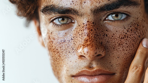 © NewMaii, Fototapeta premium A close-up portrait of a young man showcasing his unique freckles and striking green eyes, capturing natural beauty and individuality.