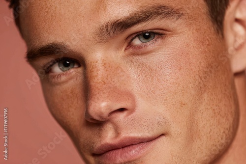 Obraz premium A close-up portrait of a young man with natural freckles and captivating eyes.