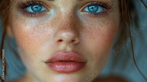 © Emiliia, Fototapeta premium A close-up portrait of a young woman, with freckles and blue eyes looking directly at the camera.