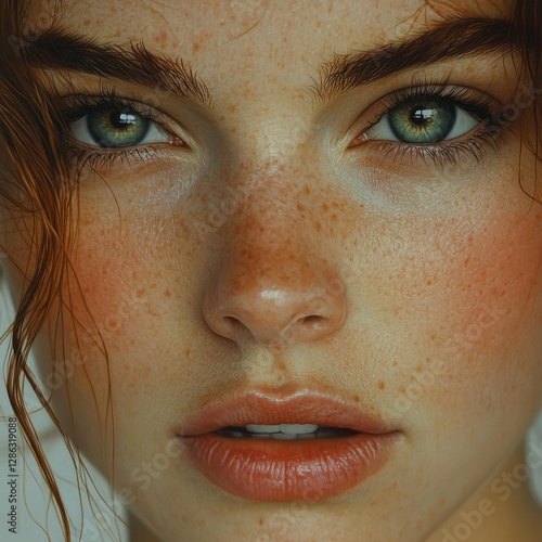 © FirstJaravee, Fototapeta premium A close-up portrait of a young woman with freckles and striking green eyes.