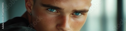 © Fotograf, Obraz premium A close-up portrait of someone with bright blue eyes