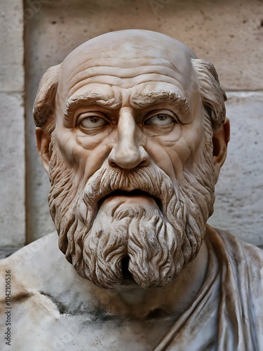 © graphicparadise1, Fototapeta premium A close-up portrait resembling an ancient marble bust of Socrates.
