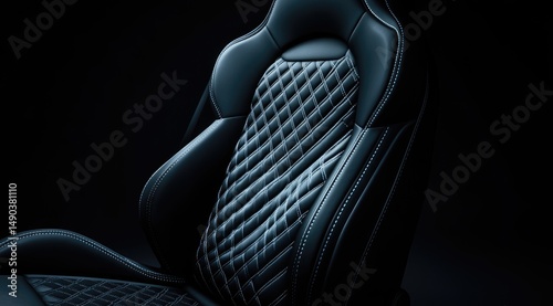 © Selsi, Naklejka premium A close-up reveals a luxurious, dark-blue leather car seat with a striking diamond-patterned quilted design, subtly lit against a black backdrop.