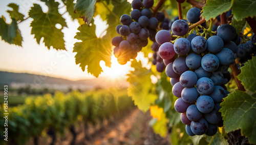 © Lana, Fototapeta premium A close-up ripe wine grapes hanging from a green vine at sunset