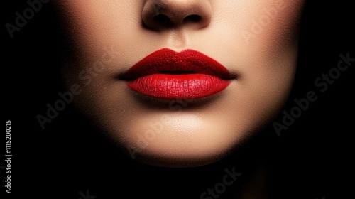 © Rose on Lens, Fototapeta premium A close-up shot highlighting perfectly shaped lips adorned with vibrant red lipstick against a dark background.