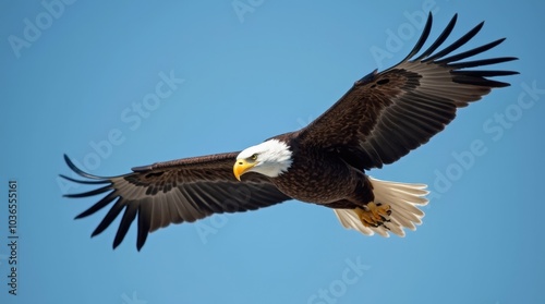 Naklejka premium A close-up shot of a bald eagle soaring through a clear blue sky, wings fully...