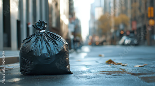 © Shanorsila, Obraz premium A close-up shot of a black garbage bag tied securely, sitting on a clean, urban street with a blurred background of city life, emphasizing waste management