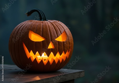 © Rizqy, Fototapeta premium A close-up shot of a carved pumpkin with a scary face, illuminated from within.