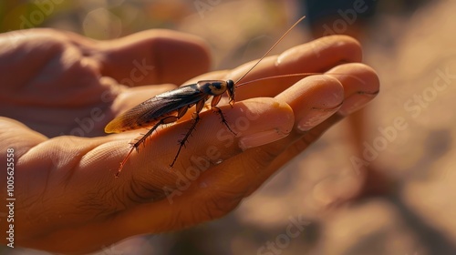 © ECLIVN, Obraz premium A close-up shot of a cockroach resting on a person's hand.