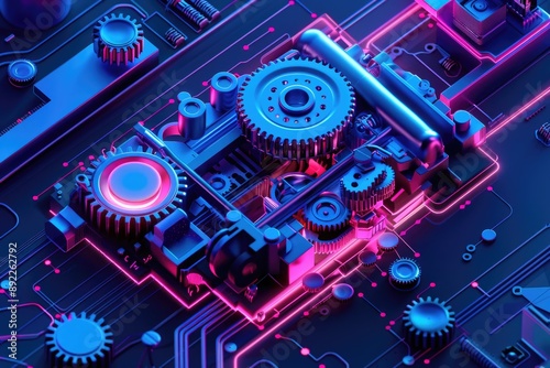 © Fotograf, Obraz premium A close-up shot of a computer motherboard with visible gears and components