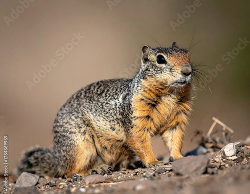 © Jajank, Naklejka premium A close-up shot of a curious squirrel looking towards the right on a sunny day