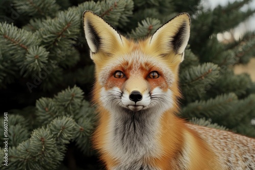 © Ева Поликарпова, Obraz premium A close-up shot of a foxy face in front of a tree trunk