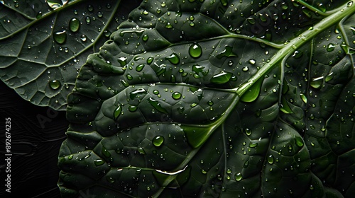 Fototapeta premium A close-up shot of a fresh collard green leaf with droplets of water glistening on its surface, showcasing its fresh and juicy texture, set against a dark, textured background to enhance the vibrant