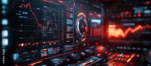 © adiba, Obraz premium A close-up shot of a futuristic computer screen displaying various data visualizations and graphs, with a strong focus on a red line graph showing a downward trend.