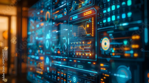 Fototapeta premium A close-up shot of a futuristic digital interface with data visualizations on a large screen