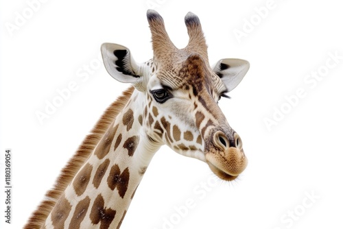 © Fotograf, Fototapeta premium A close-up shot of a giraffe's face against a white background