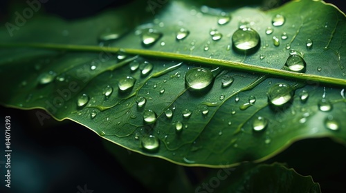 Fototapeta premium A close-up shot of a green leaf with water droplets glistening on its surface