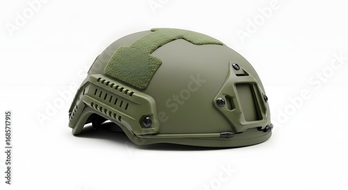 Fototapeta premium A close up shot of a green tactical helmet with velcro and rails on a white...