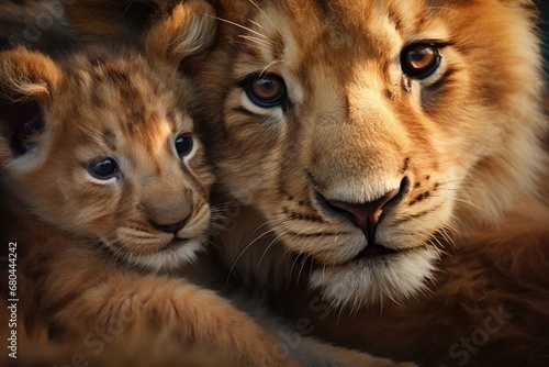 Fototapeta premium A close up shot of a lion and a baby lion. This image captures the bond...