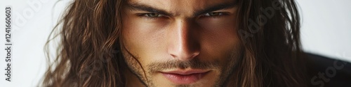 Obraz premium A close-up shot of a man's face with long hair, suitable for use in a variety...
