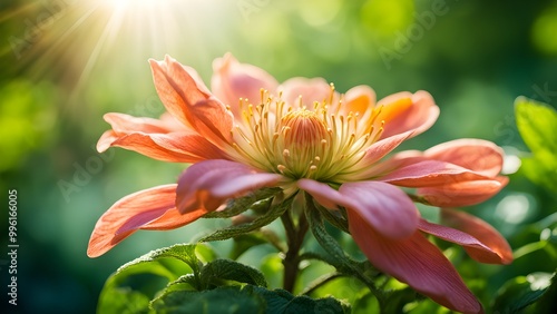 Naklejka premium A close-up shot of a pink flower with sun rays shining through the petals.