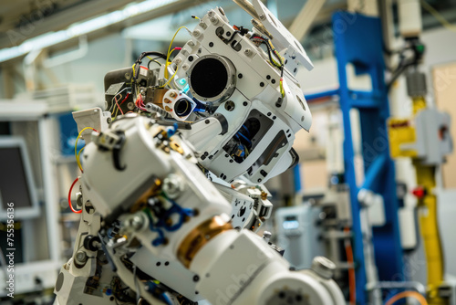 © kalafoto, Fototapeta premium A close-up shot of a robot assembling components for a new space habitat