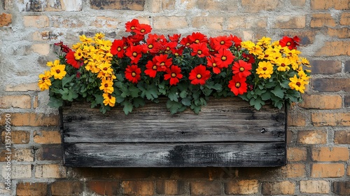 Naklejka premium A close up shot of a rustic wooden window box filled with vibrant red and yellow flowers, against a vintage brick wall