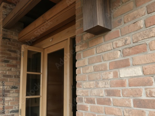 Fototapeta premium A close-up shot of a textured storefront with weathered brick walls and rustic wooden beams, old, textured