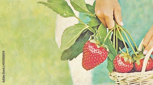 © Olga, Obraz premium A close-up shot of a woman holding a woven strawberry basket against a green and white backdrop