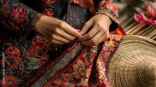 Fototapeta premium A close-up shot of a woman’s hands adjusting the silk sash of her Ao Tu Than dress, the intricate patterns and texture of the fabric captured in high detail,