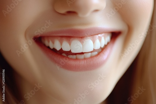 Fototapeta premium A close-up shot of a woman smiling while holding a toothbrush in her mouth, a...