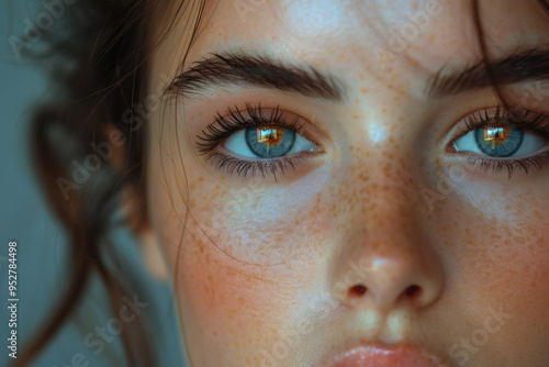 Fototapeta premium A close-up shot of a young woman with striking blue eyes and freckles,...