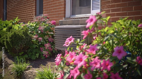 Fototapeta premium A close-up shot of an air conditioner unit placed beside a bouquet of flowers