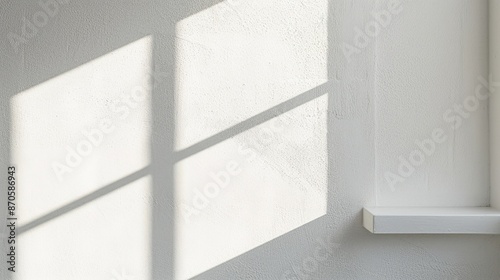 © Putt_Sanplee, Obraz premium A close-up shot of an angled shadow cast by a window frame onto a pristine white wall, with subtle texture and soft lighting.